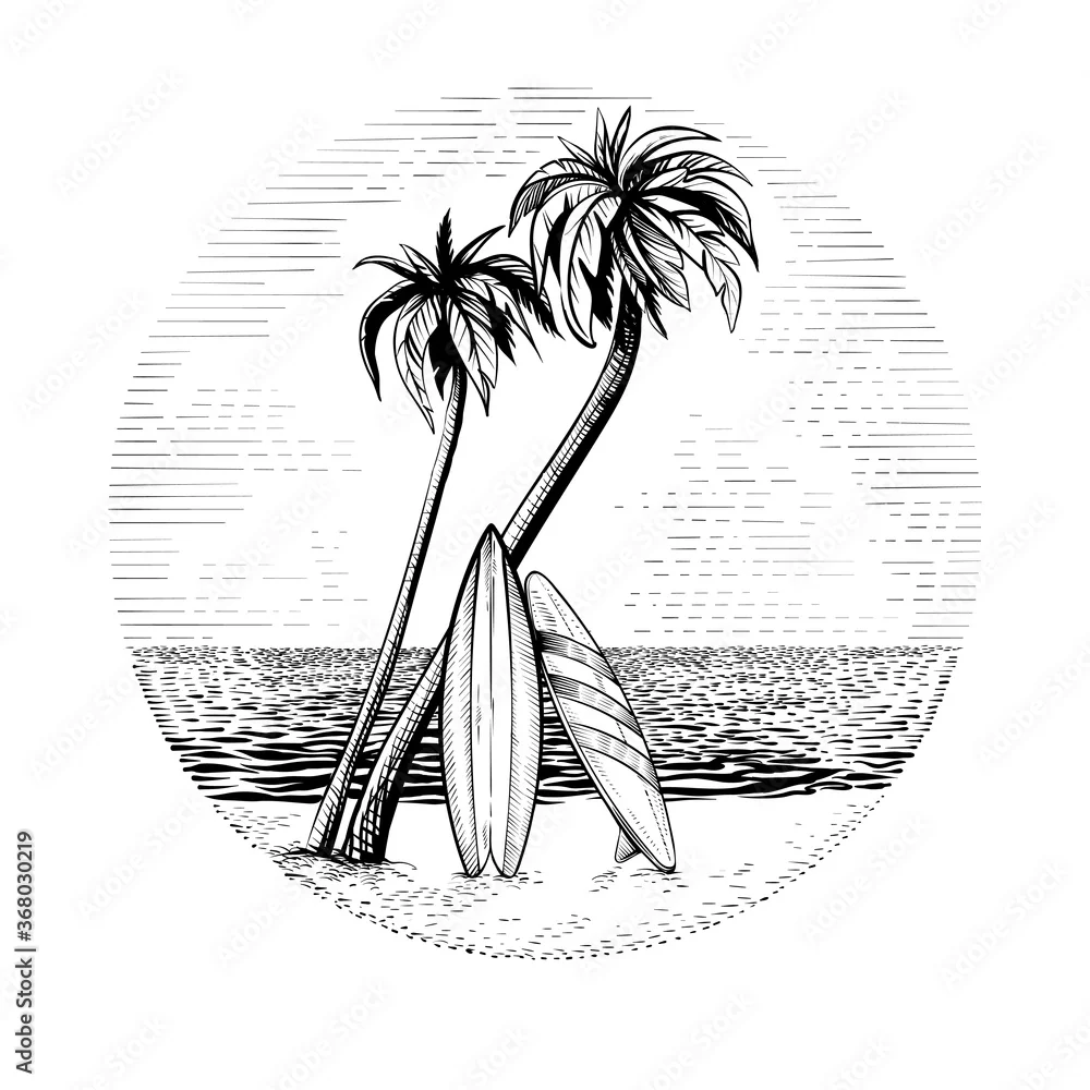 Obraz Surfboards under the palm trees, vector beach surfing round design.