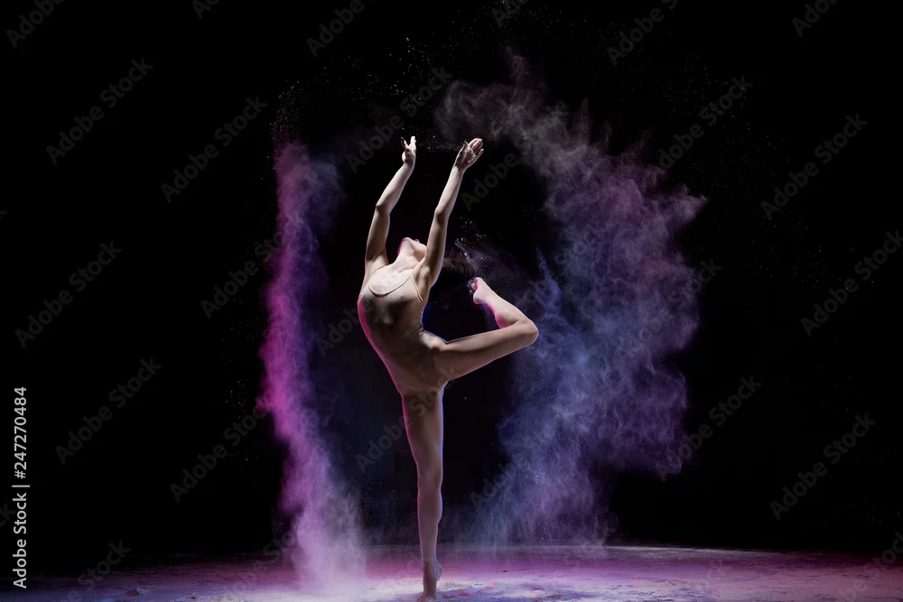 Obraz Majestatyczna dancingowa kobieta w kolorowym latającym proszku