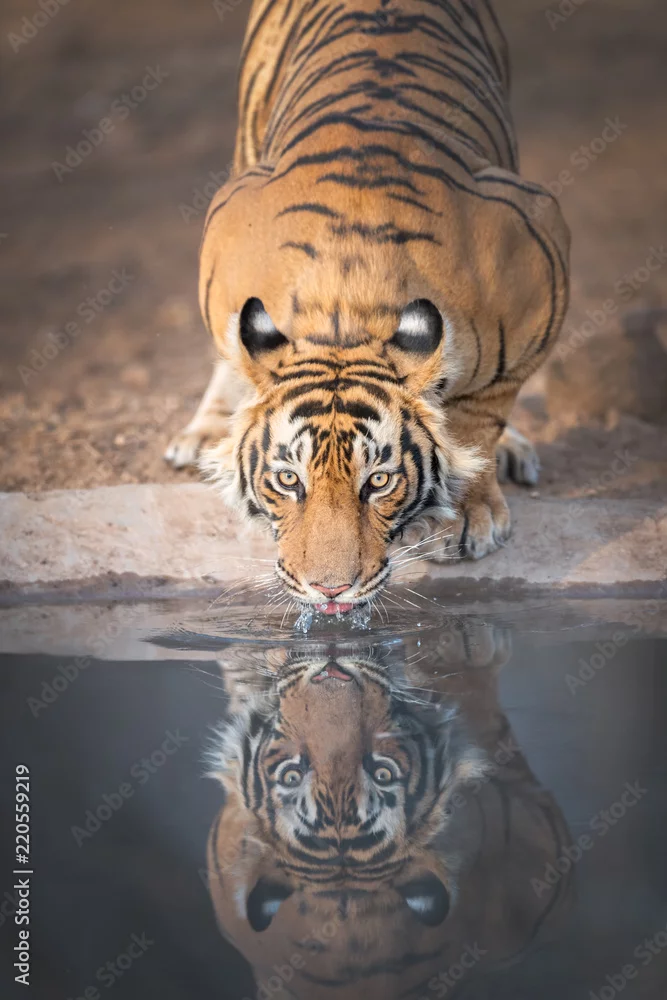 Obraz Tygrys bengalski pije wodę z wodopoju w Parku Narodowym Ranthambhore