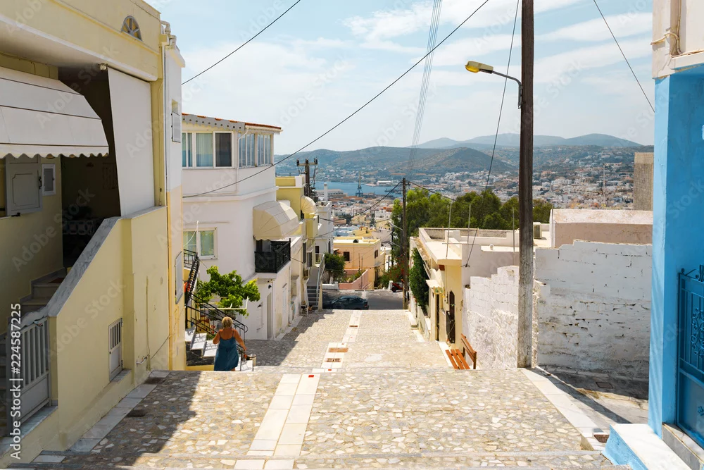 Obraz Wygodne wąskie uliczki starego kurortu europejskiego miasta w słoneczny letni dzień. Niskie budynki lokalnych mieszkańców, małe kawiarnie i hotele. Miasto Ermoupolis na wyspie Syros, Cyklady, Grecja.