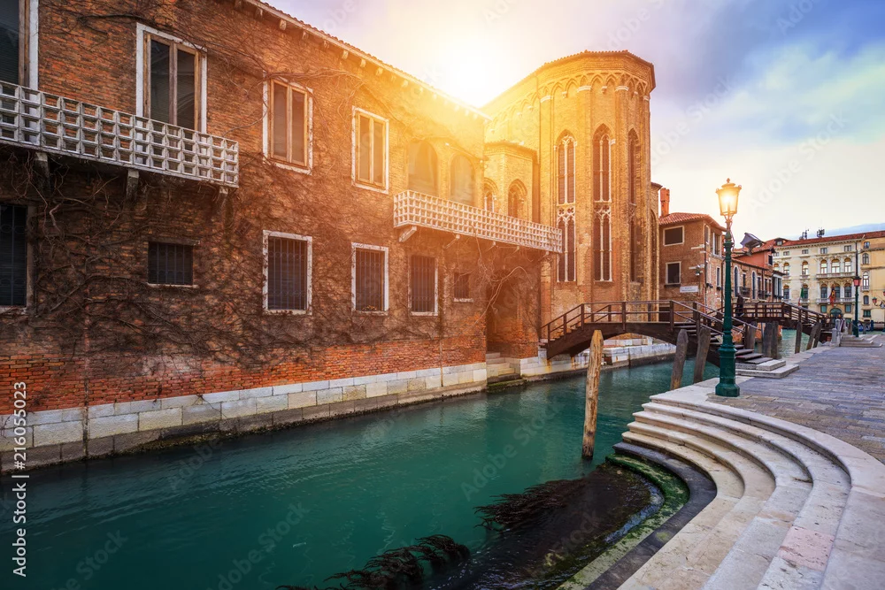 Obraz Uliczny kanał w Wenecja, Włochy. Wąski kanał wśród starych kolorowych cegieł domów w Wenecja, Włochy. Pocztówka z Wenecji