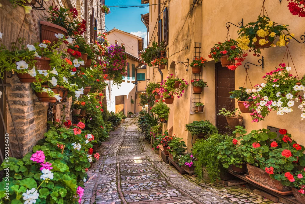 Obraz Kwiatowa ulica w środkowych Włoszech, w małym średniowiecznym Umbrii do
