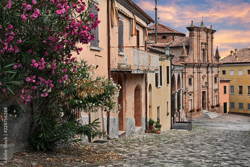 Obraz Longiano, Forli-Cesena, Emilia-Romagna, Włochy: pejzaż miejski z kwiatami oleandra i starożytny kościół