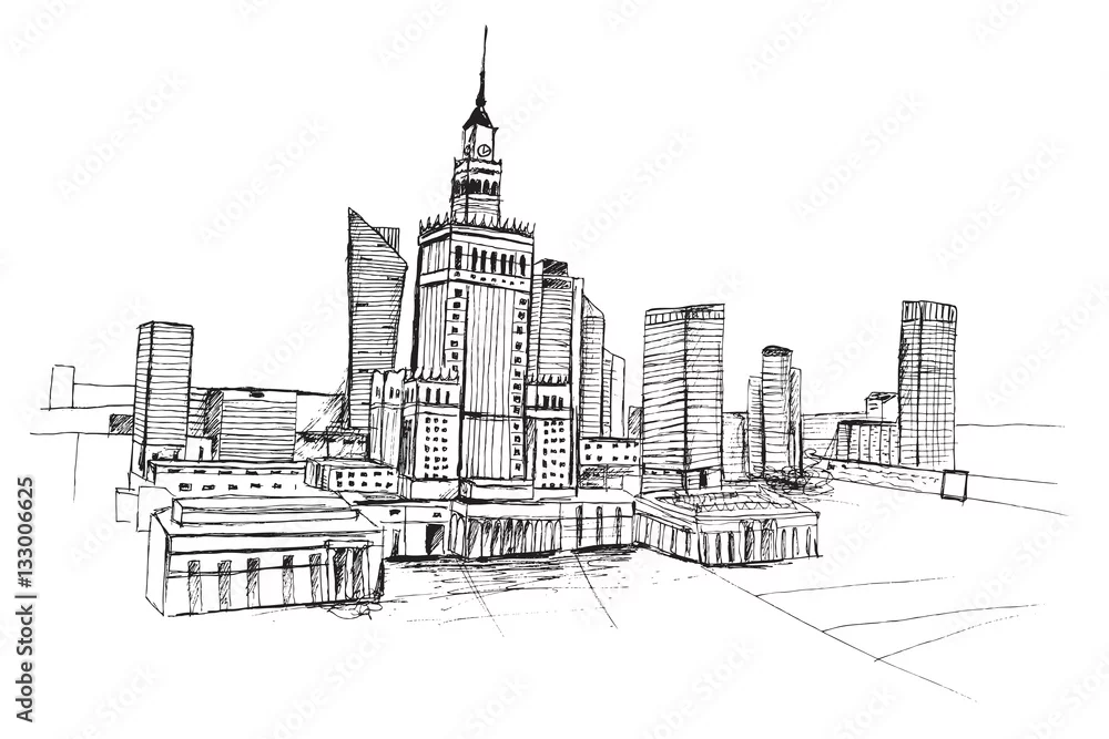 Obraz Panorama miasta Warszawa. Rysunek ręcznie rysowany na białym tle. - Warszawa - Picturewall.pl