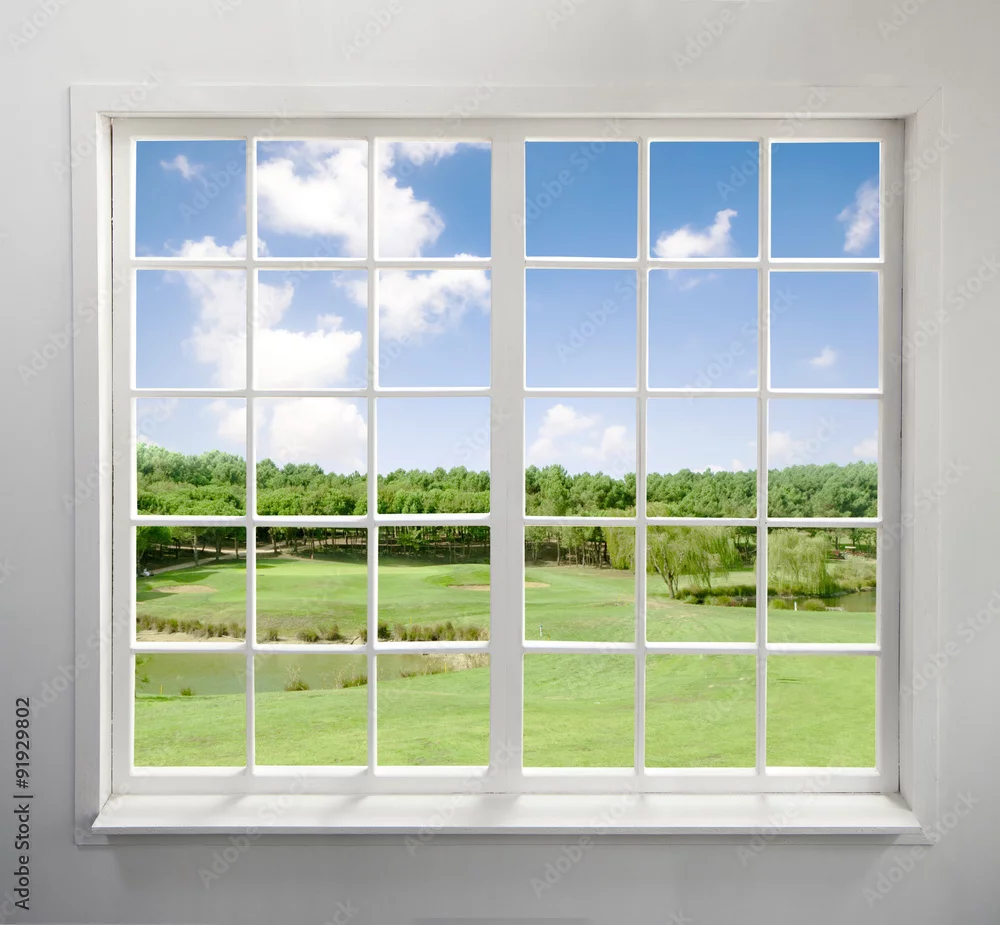 Obraz Nowoczesne okno mieszkalne z widokiem na jezioro