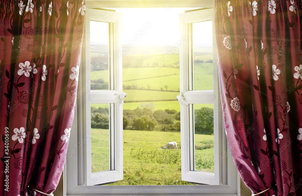 Obraz Otwarte okno z widokiem na okolicę i wpadającym światłem słonecznym