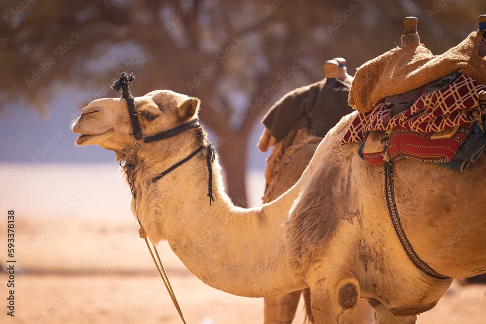 Obraz Wadi Rum w Jordanii. Ujęcie z bliska idącego wielbłąda po pustyni na tle drzewa.