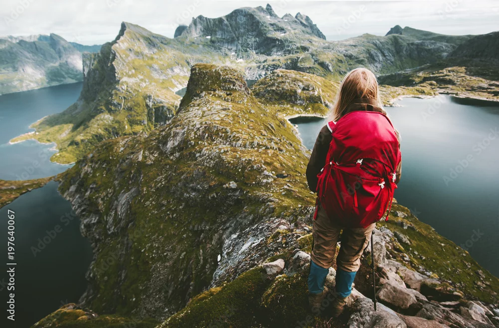 Obraz Podróżnicza kobieta odkrywa góry Norwegia z czerwonym plecakiem Podróżuje zdrowego styl życia przygody pojęcia lata aktywnych wakacji wycieczkować plenerowy
