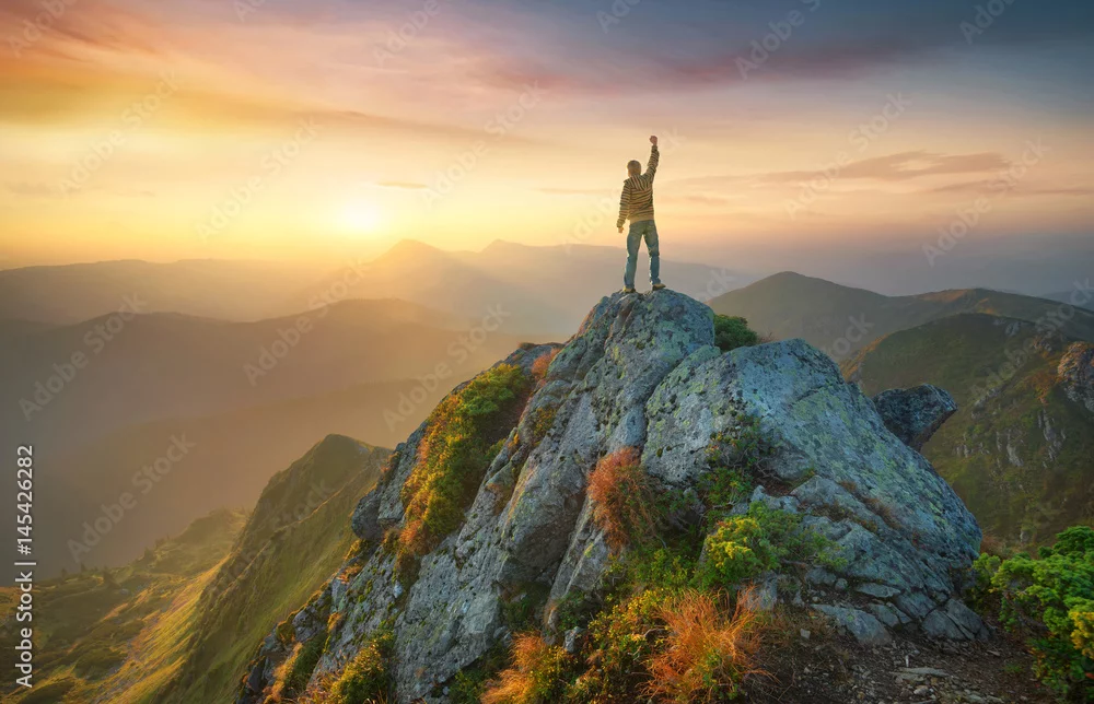 Obraz Turysta na szczycie wysokich skał. Pojęcie sportu i aktywnego życia