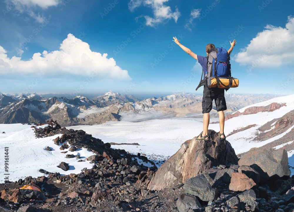 Obraz Turysta na szczycie wysokich skał. Pojęcie sportu i aktywnego życia ..