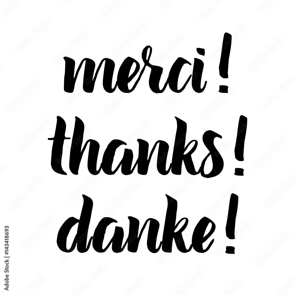 Dziękuję zdanie, ręcznie rysowane czarne litery, nakładka na zdjęcia w stylu vintage. Dzięki, merci, danke po angielsku, francusku, niemiecku. Nowoczesna pędzelkowa kaligrafia dla karty z pozdrowieniami, koszulki, nadruków i plakatów