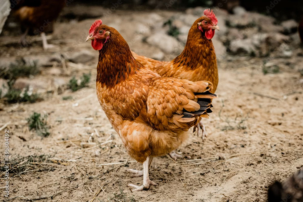 Obraz 2 kury na wsi - brązowe nioski - szczęśliwe kury - zwierzęta hodowlane