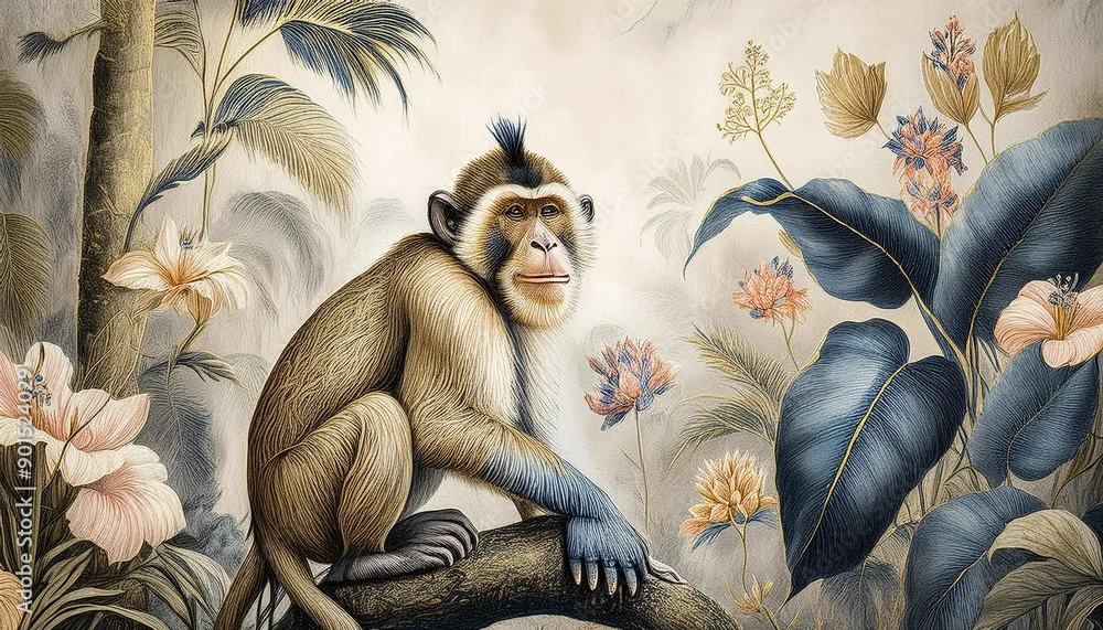 Obraz Tropikalny las z małpami. Tapeta, tło, grafika w stonowanych kolorach
