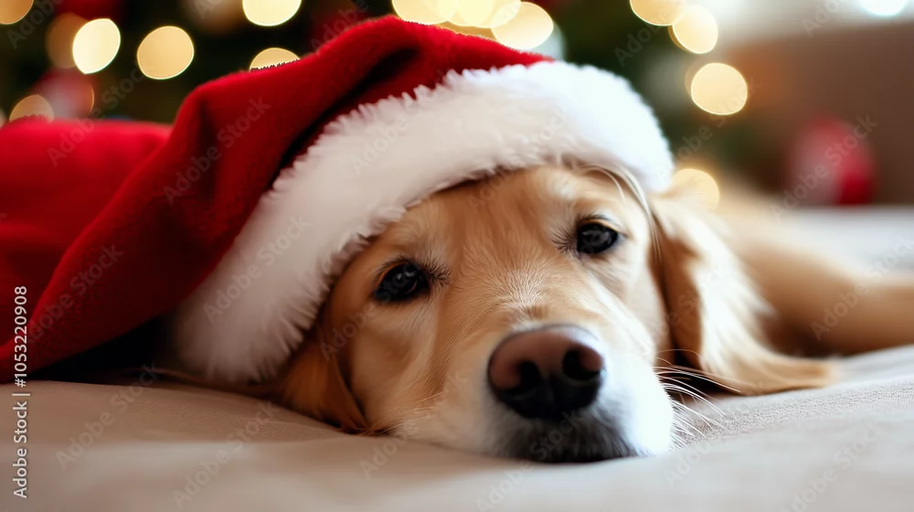 Obraz Uroczy piesek z czapką Świętego Mikołaja stoi w świątecznym otoczeniu.