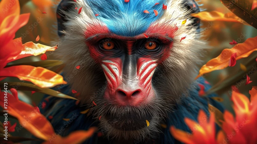 Obraz Zdjęcie przedstawia małpę o niebiesko-czerwonym obliczu, która jest otoczona liśćmi.
