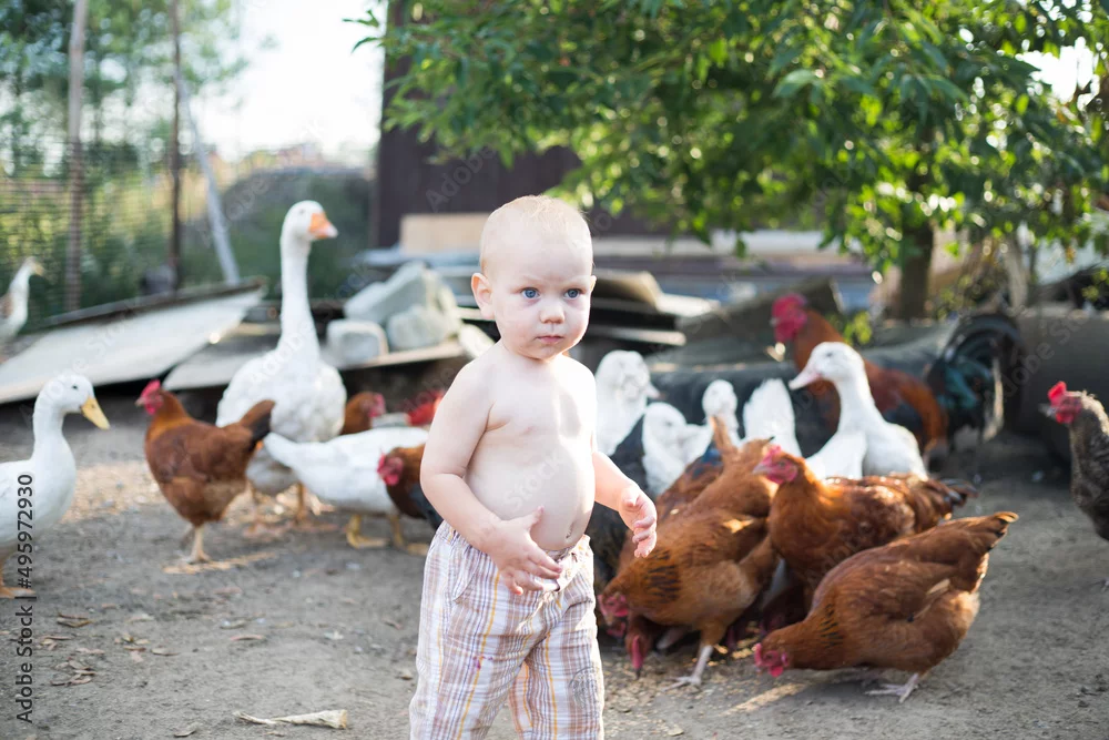 Obraz dzieci i zwierzęta - chłopiec karmi kurki i kaczki na wolnym wybiegu