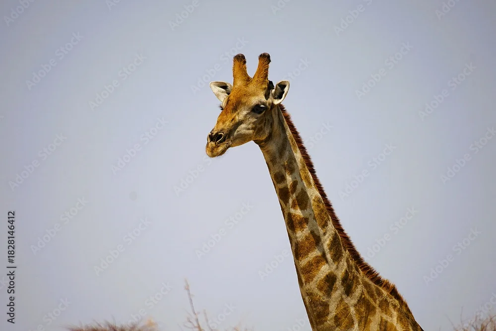 Obraz Portrait photograph of the head and neck of an adult southern giraffe, also known as a two-horned giraffe, taken in a national park in the African savannah. Giraffa giraffa.