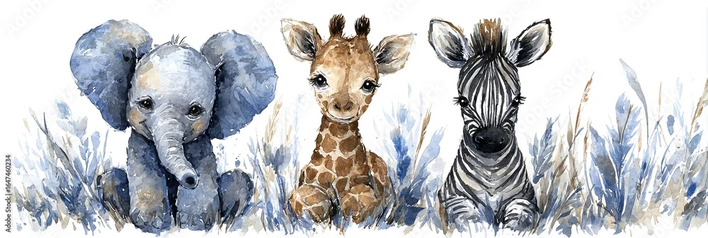 Obraz AKWARELOWE ILUSTRACJE MAŁEGO SŁONIA, ŻYRAFY I ZEBRY