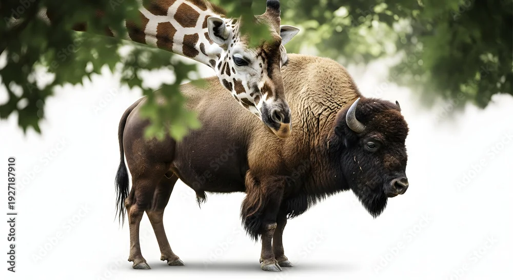 Obraz Wildlife portrait bison and giraffe in natural habitat animals in harmony