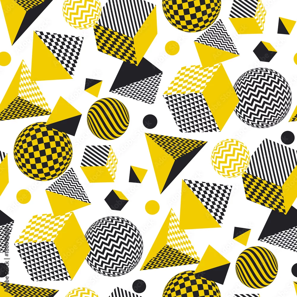 Tapety Abstrakta 3d geometryczny bezszwowy wzór w kolorze żółtym i czarno. Geometria iluzji objętości kształtuje powtarzalny motyw. Element graficzny do projektowania powierzchni, tkanin, papieru do pakowania.