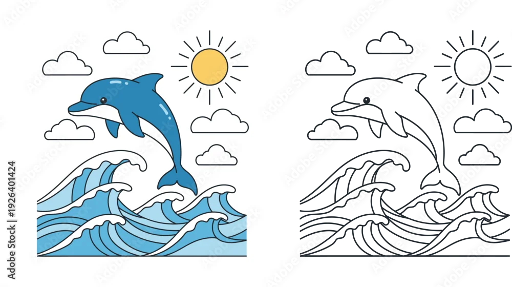 Tapety Cute jumping dolphin over ocean waves vector illustration. Includes colored flat design and black and white line art outline for coloring book pages.