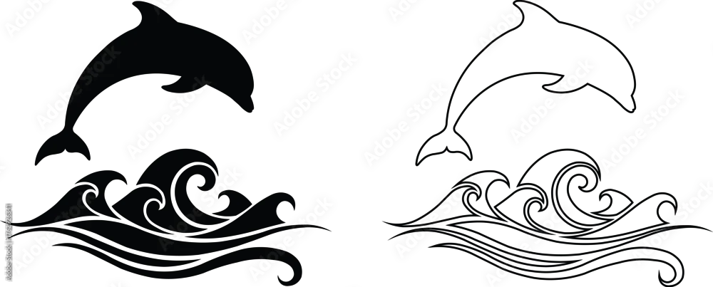 Tapety Vector art of black and white outline and silhoutte of a dolphin jumping out of the ocean waves - delfiny - Picturewall.pl