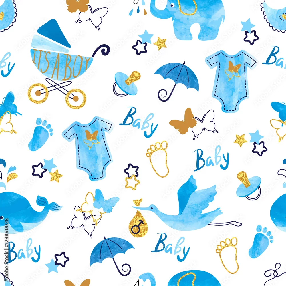 Tapety Baby prysznic chłopiec wzór. Tło wektor akwarela dzieci. - dla chłopaków - Picturewall.pl
