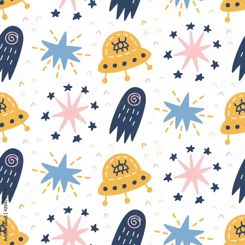 Tapety Kosmiczna galaktyka dziecięca bez szwu z UFO, gwiazdami, kometami, elementami kosmicznymi - dla chłopaków - Picturewall.pl