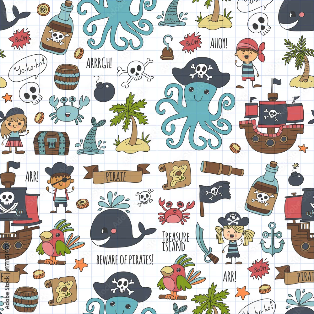 Tapety Wektor wzór Piracka impreza dla dzieci Przedszkole Dzieci rysunek styl ilustracji Picutre z piratem, wielorybem, wyspa skarbów, mapa skarbów, czaszki, flaga, statek Urodziny - dla chłopaków - Picturewall.pl