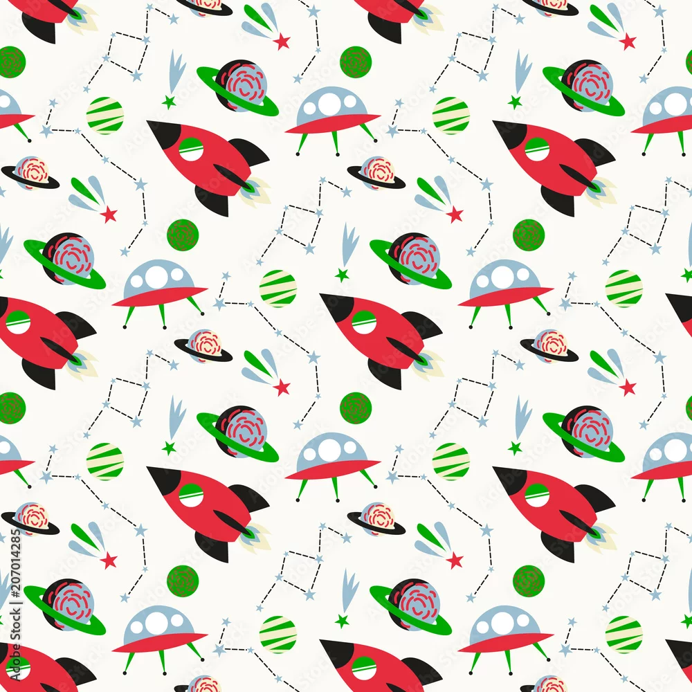 Tapety Astronautyczny bezszwowy deseniowy wektorowy tło. Statek kosmiczny, planety, rakieta, gwiazda, UFO i kometa modny wzór dla dzieci. Dziecinne tło wektor. - dla dzieci - Picturewall.pl