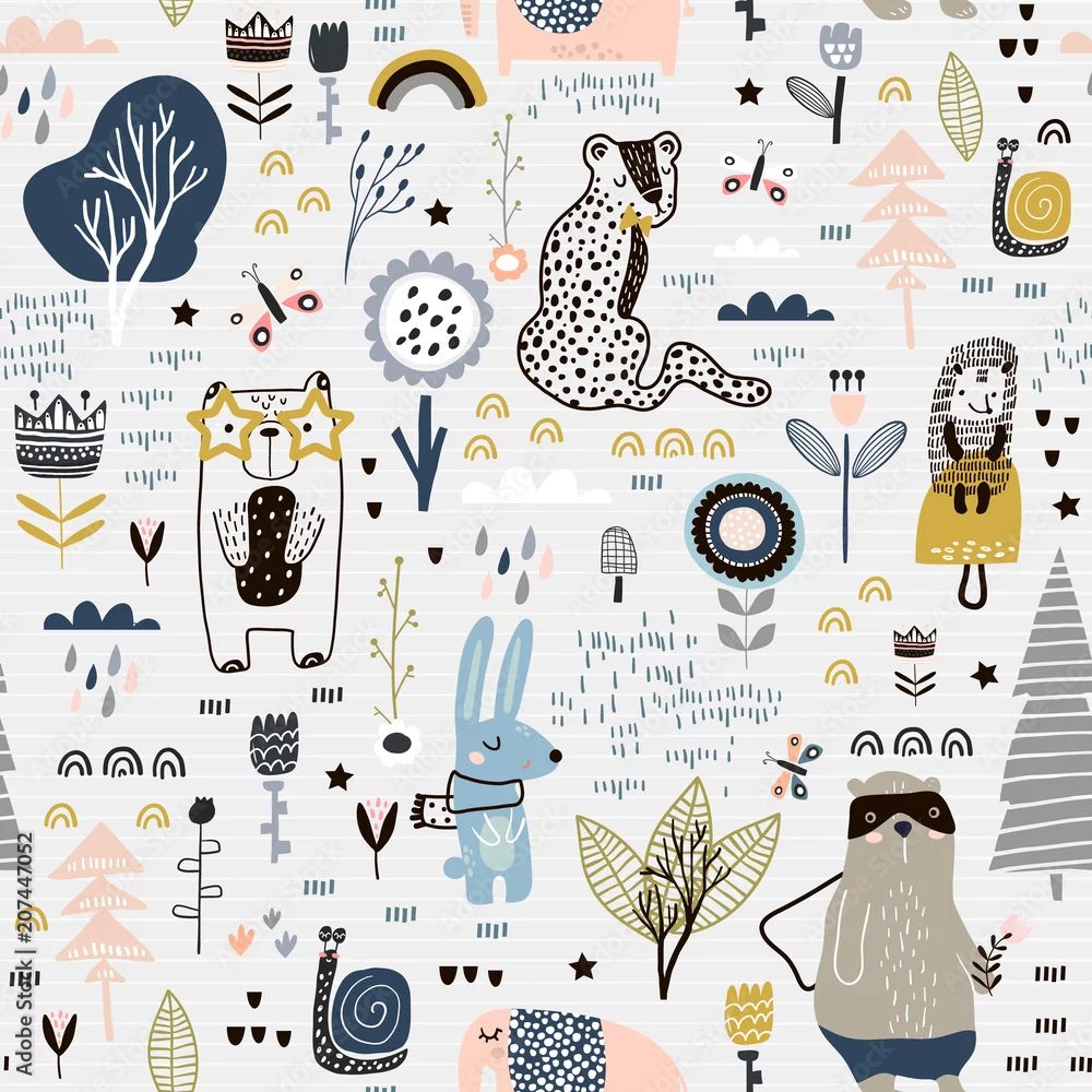 Tapety dziecięcy wzór z czarodziejskimi kwiatkami i zwierzątkami