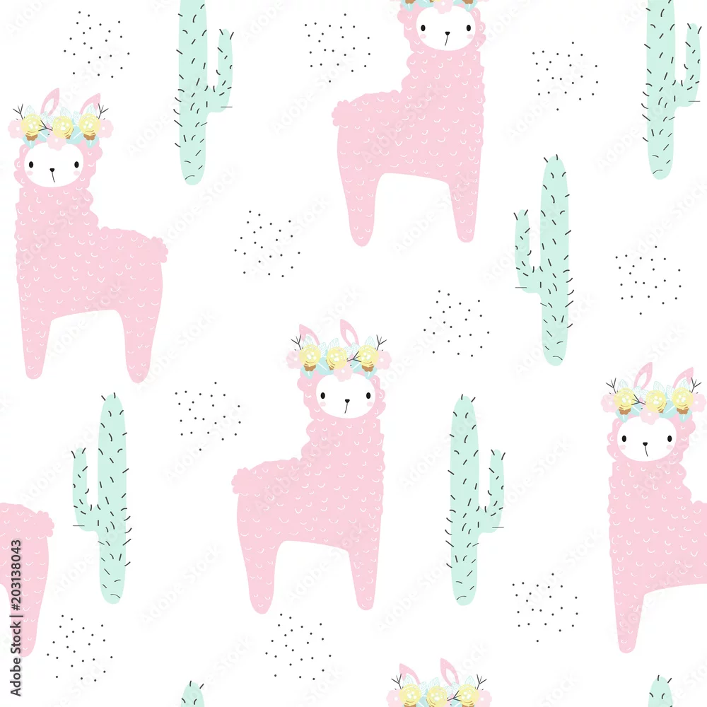 Tapety Ładny różowy Lamy z wieniec kwiatowy wzór. Wektorowa ręka rysująca ilustracja. - dla dzieci - Picturewall.pl