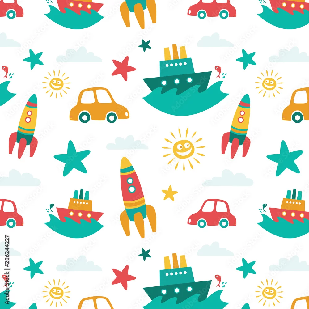 Tapety Śliczne pojazdy kolorowe wektor wzór dla dzieci, odpowiednie do dekoracji pokoju dziecięcego. - dla dzieci - Picturewall.pl