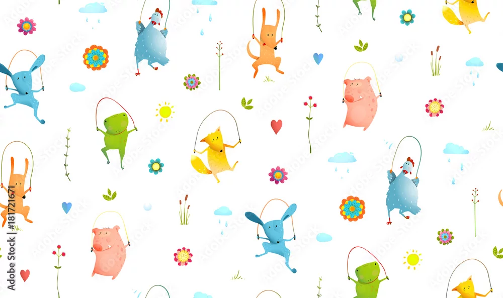Tapety Śmieszne zwierzęta, skoki, zabawy na przezroczystym tle wzór. Kreskówka wektor - dla dzieci - Picturewall.pl