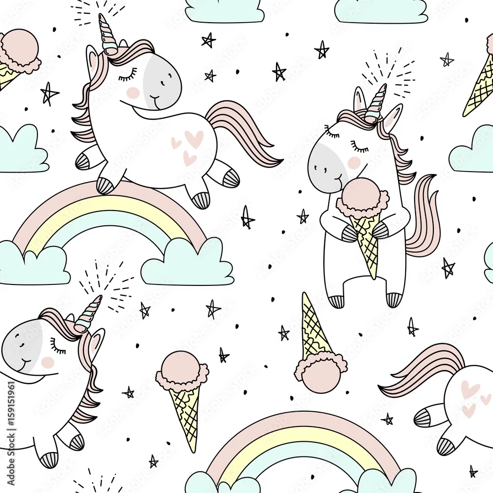 Tapety Wektor wzór z słodkie jednorożce, chmury, tęcza i gwiazdy. Magiczne tło z małymi jednorożcami. - dla dzieci - Picturewall.pl