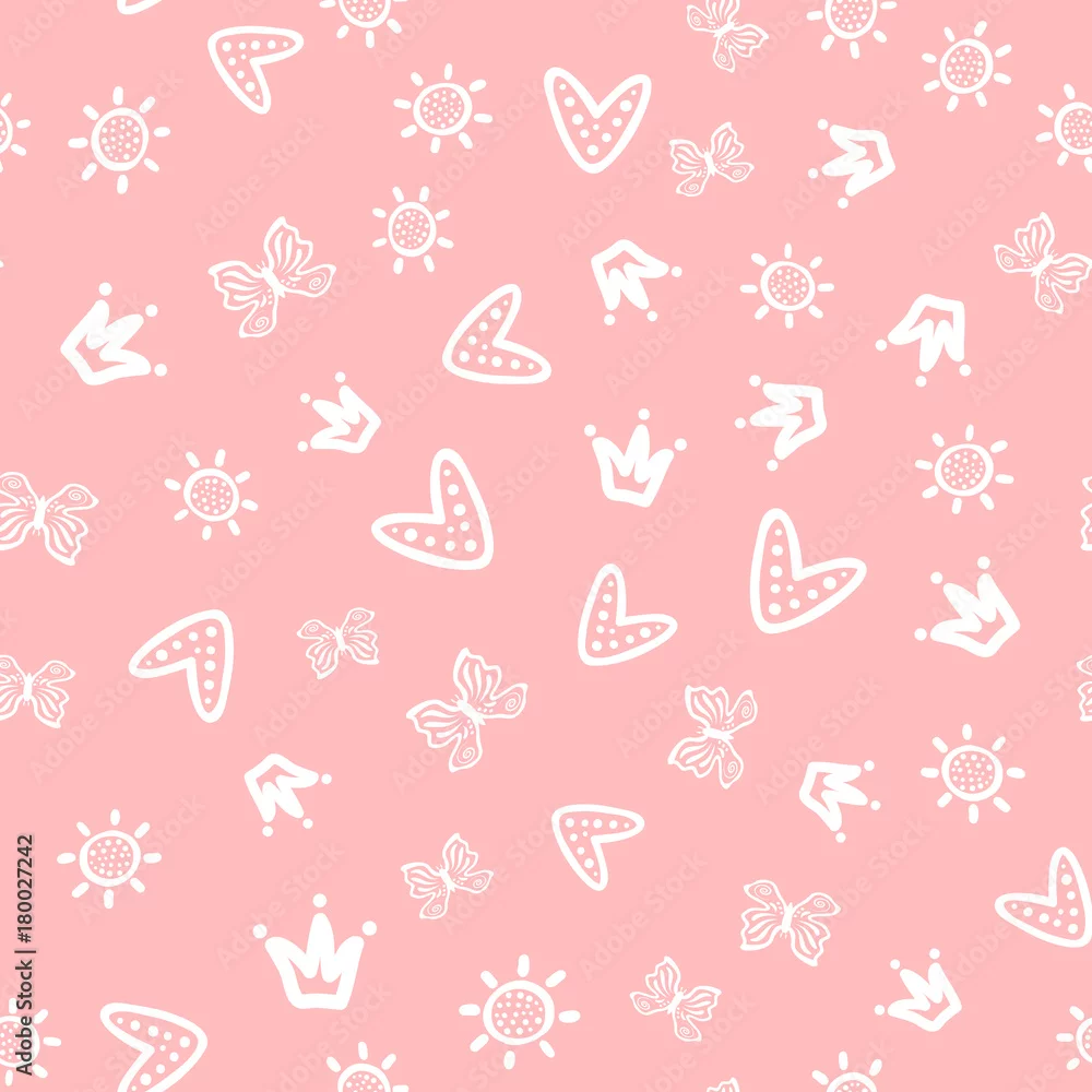 Tapety Słońce, motyle, serca i korony rysowane ręcznie. Ładny dziewczęcy wzór. Szkic, bazgroły. Białe kontury na różowym tle.