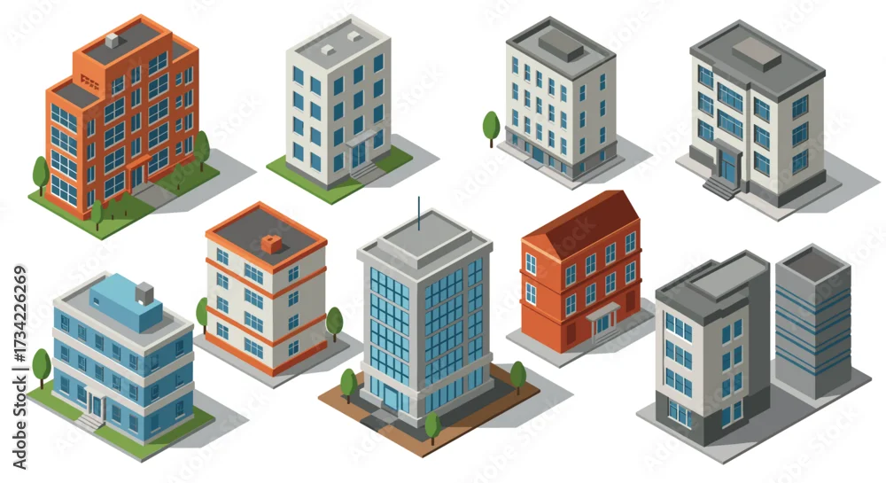 Tapety Isometric urban building set featuring diverse architectural styles for design projects - do architekta - Picturewall.pl