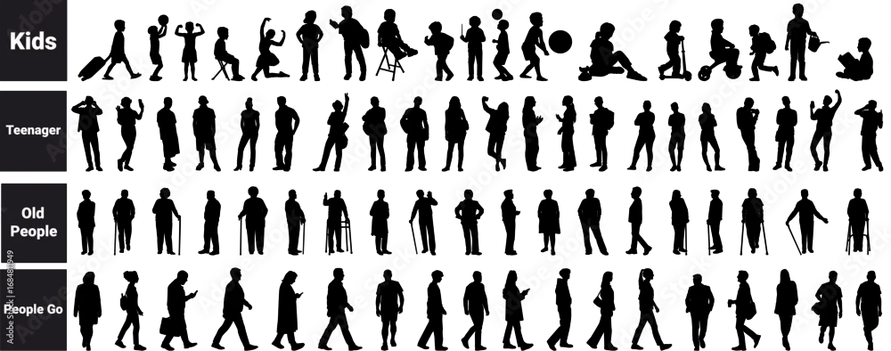 Tapety silhouettes of architecture drawing people. Architectural drawing kids, teenagers, grandparents or old people and people go set in row section elevation view. characters in architectural. - do architekta - Picturewall.pl