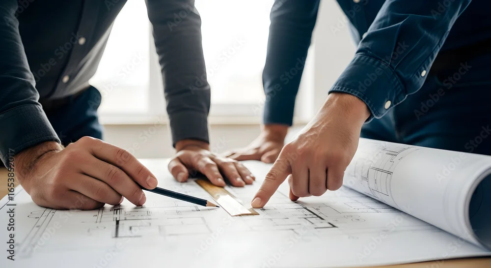Tapety Team of professionals collaborating over architectural blueprints, focused on planning and strategy for a new project, fostering teamwork and expertise - do architekta - Picturewall.pl