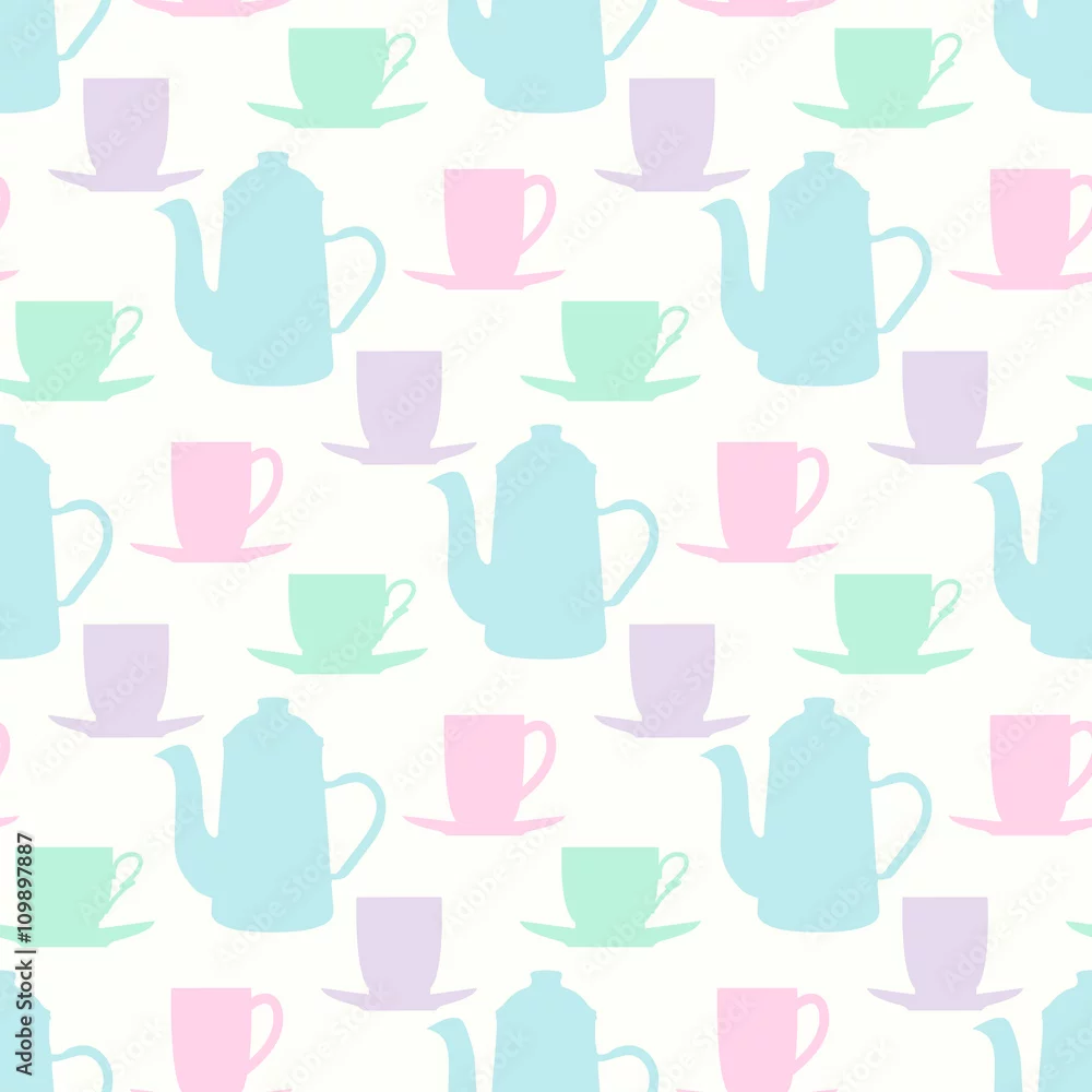 Tapety Vintage bezszwowe wektor wzór z czajniki, kubki do herbaty i filiżanki kawy - do jadalni - Picturewall.pl