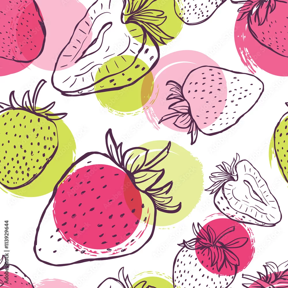 Tapety Wektorowy bezszwowy wzór z truskawkami i kolorowymi akwarela kleksami. Ręcznie rysować tło z czarno-białych jagód liniowych. Projektowanie tkanin, druk na tekstyliach, papier pakowy.