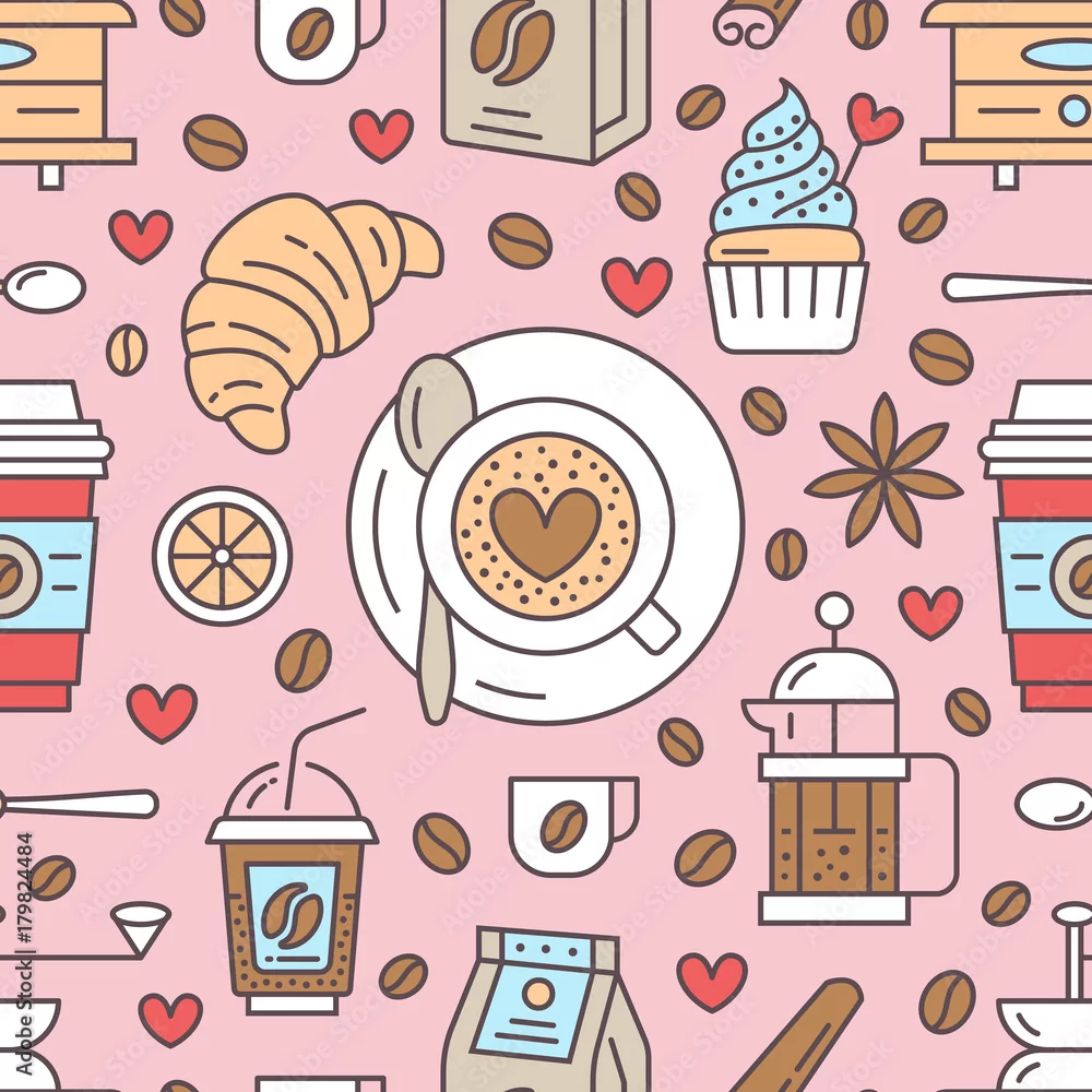 Tapety Bezszwowy wzór kawa, wektorowy tło. Słodkie napoje, gorące napoje kolorowe ikony płaskiej linii - ekspres do kawy, fasola, filiżanka, młynek. Powtarzająca się tekstura menu kawiarni, papier do pakowania w sklepie.
