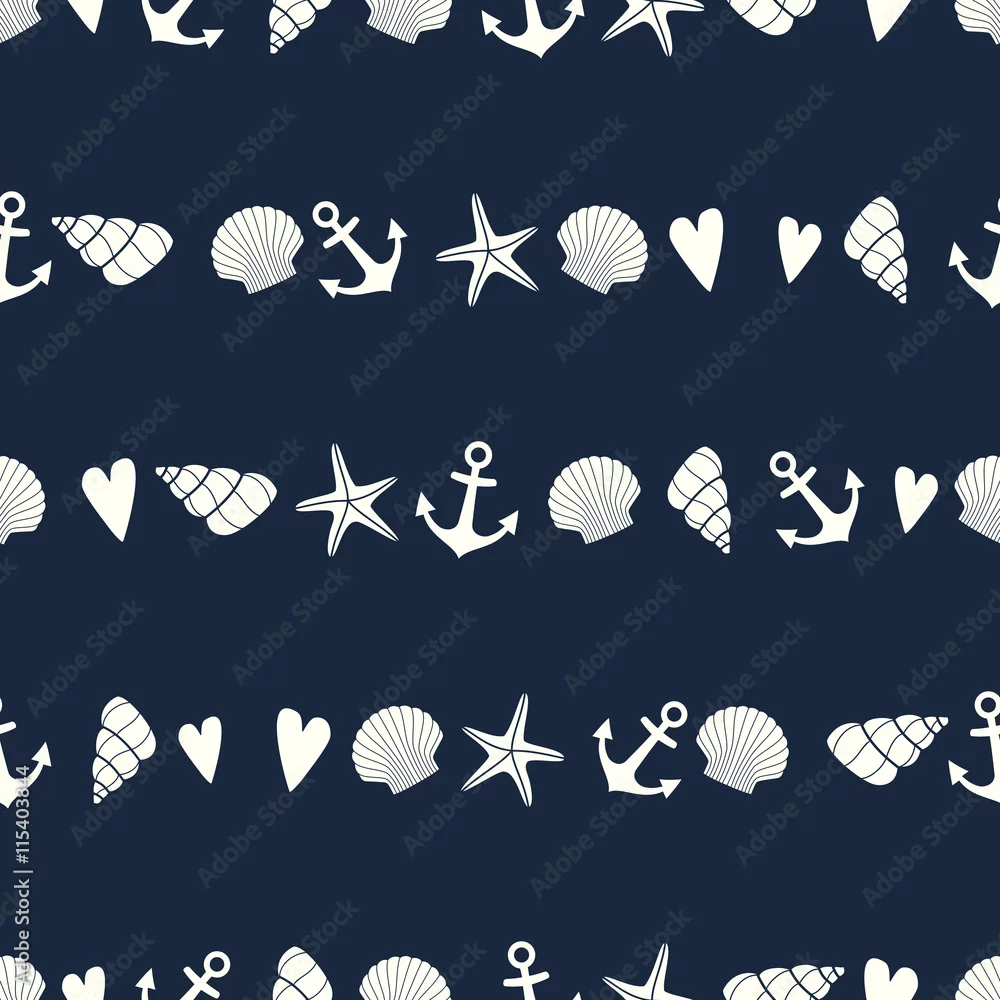 Tapety Morski wzór z rozgwiazdy, muszli i kotwicy. Tło ładny życia morskiego. Motyw morski. Projektowanie tkanin, tkanin, poduszek i dekoracji.