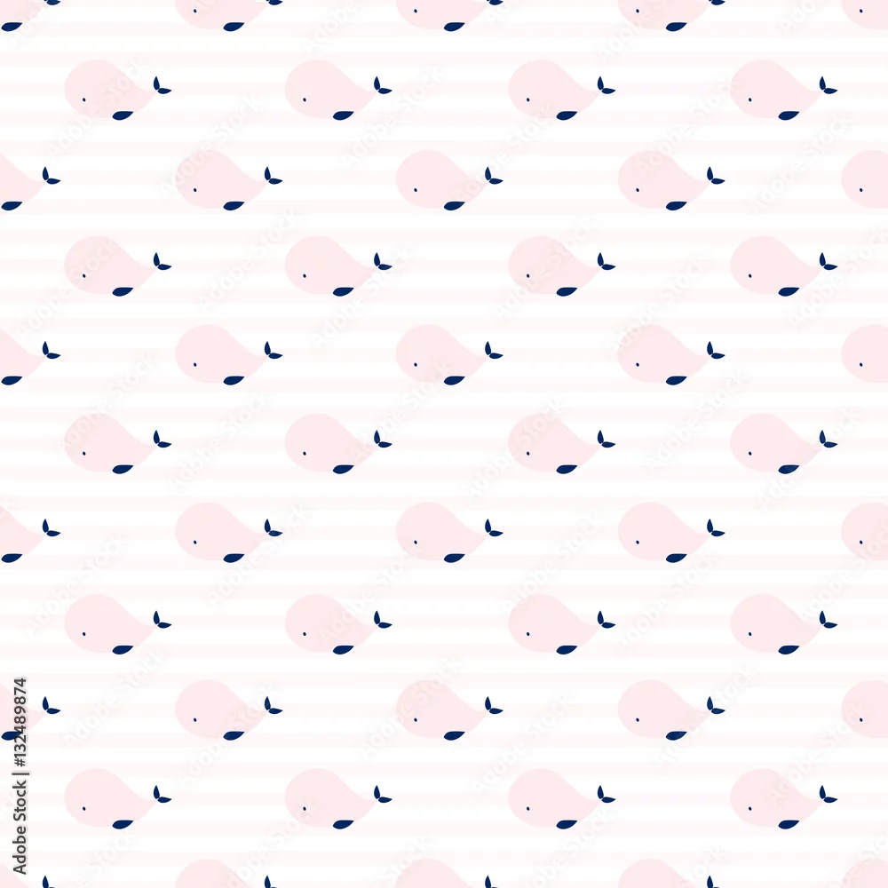 Tapety Śliczny wieloryby geometryczny wzór. Prosty i delikatny. Pastelowe kolory różowy i niebieski. Paski tle. - do łazienki - Picturewall.pl