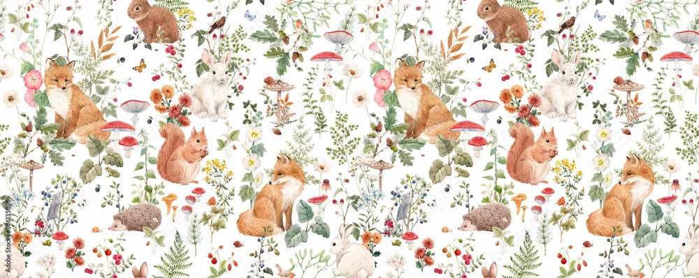 Tapety Large size wall mural with hand drawn watercolor forest animals and plants. Stock illustration.