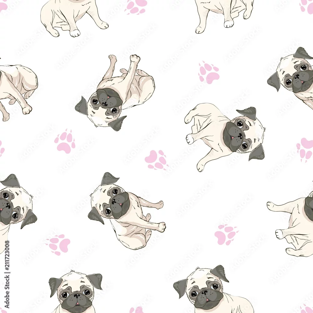 Tapety Wektorowy bezszwowy wzór z ślicznymi kreskówka psa szczeniakami. Może być używany jako tło, tapeta, tkanina i do innego projektu. Wzór Buldog francuski