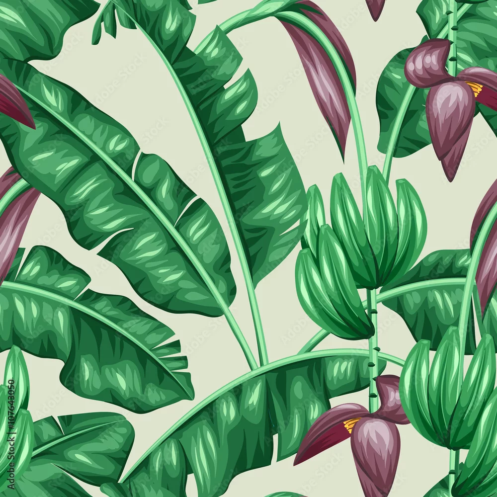Tapety Wzór z liści bananowca. Dekoracyjny obraz tropikalnych liści, kwiatów i owoców. Tło wykonane bez maski przycinającej. Łatwy w użyciu na tle, tkaninach, papierze do pakowania