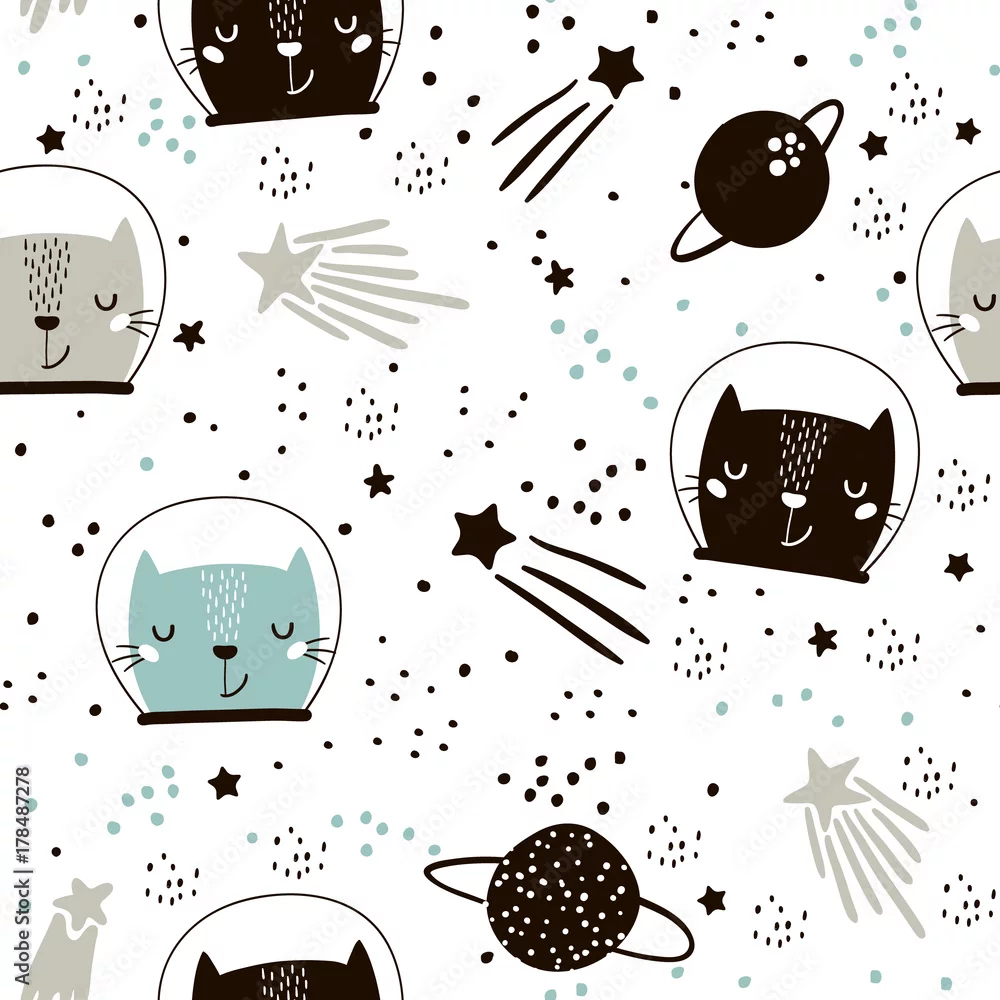 Tapety Jednolity wzór dziecinna z astronautów cute kotów. Tło kreatywnych przedszkola. Idealny do projektowania dla dzieci, tkanin, opakowań, tapet, tkanin, odzieży
