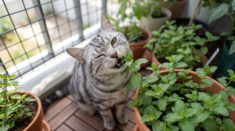 Tapety A gray tabby cat enjoys mint leaves on a wooden balcony surrounded by potted plants - koty - Picturewall.pl