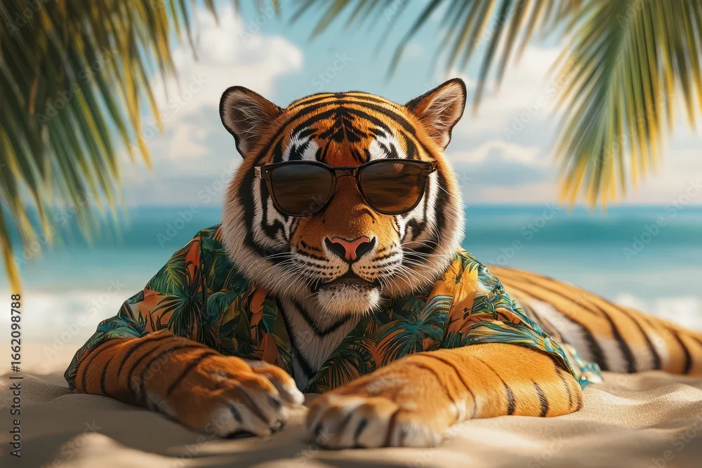 Tapety Relaxed Bengal tiger in Hawaiian shirt on beach - koty - Picturewall.pl